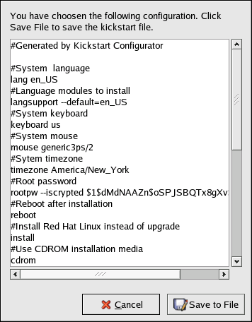 To review the contents of the kickstart file after you have finished choosing your kickstart options, select File => Preview from the pull-down menu.