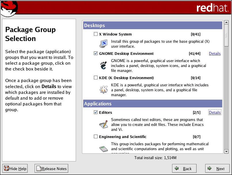 You can select package groups, which group components together according to function (for example, X Window System and Editors), individual packages, or a combination of the two.